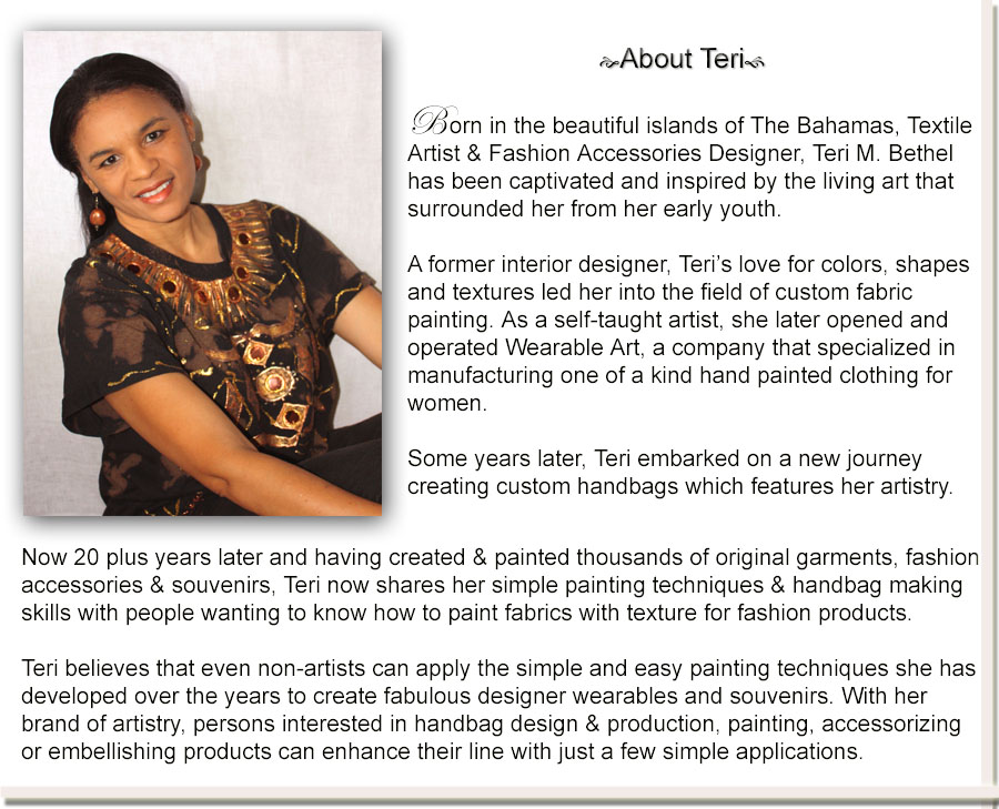 I can't really include everything in this outline because there's much, more in store for you. Now is the time to uncover the creative designer that is inside you. There are painting videos to help you; ready and waiting for you to access. You can use your videos anytime day or night; all you need is internet access. View your videos according to interest, no special order is required. So, get ready to discover your hidden talents. Have fun learning at your pace and soon you'll be painting on fabric like a pro! Let's Have Fun Creating Stunning Clothing, Handbags, Shoes & Crafts You Will LOVE! Sign up below for your 2 month Complete Fabric Painting Course at our reduced rate! You won't pay Order my amazing painting course (Over 40 Videos & Tutorials) and Pay only $97.00!(Payment Options for Residents of The Bahamas) That's right, you'll have access to texture painting videos teaching everything from start to finish on how to paint designer textures for 2 months! Now that's less than the cost of your favorite cup of coffee a day, plus you'll be learning a skill that will last you a lifetime. Click on the blue link to register. It will take about 5 minutes (or less) and you can be on your way to creating totally amazing designs. Create 'unique' gifts for your friends and family. You can proudly say - - you made it yourself and save money in the process. And if you like, you can make some money on the side too! So get your fabrics and paint and let the artist begin! My story... I'm the designer behind the Teri Monique Handbags line. I'm also a professional Textile Artist and I have been creating and selling thousands of wearable art designs ranging from ladies painted clothing to the fabulous Teri Monique handbags and shoes! I'm a self-taught artist. I love colors and textures and creating fabulous 'one-of-a-kind' clothing, purses and handbags. The fact is I have over two decades of loving the work I do! About 23 years ago I became a little bored with my profession as an interior designer. I decided to try my hand at painting on tee shirts. I had no real knowledge of how to make money selling my painted clothing. I had no knowledge of what materials I should use or where I should buy them. So, I bought men's cheap undershirts and artists paint (the wrong kind). I painted up a batch and went knocking on any shop that would let me in. That's when I encountered a store owner (a lady) who was terribly blunt. She clearly stated that everything was wrong about my cheesy tee shirts, my hard paints and my designs. After the initial shock, I took to heart her harsh comments and was determined not give up; I decided to find a better way to create beautiful designs and to find out what I needed to know to paint with texture the right way! In less than 2 years, my painted garments were a HIT!! My sales skyrocketed! I opened a store manufacturing and painting my own line of wearable art clothing for ladies. To think, all this without any crafts or drawing skills. So, thousands of garments & handbags later, and confident of my simple techniques, I'd like to share my trade secrets with you to make your craft ideas pop! Pay only $97.00!(Payment Options for Residents of The Bahamas) Happy Painting! Teri M. Bethel admin@paintwithtexture.com