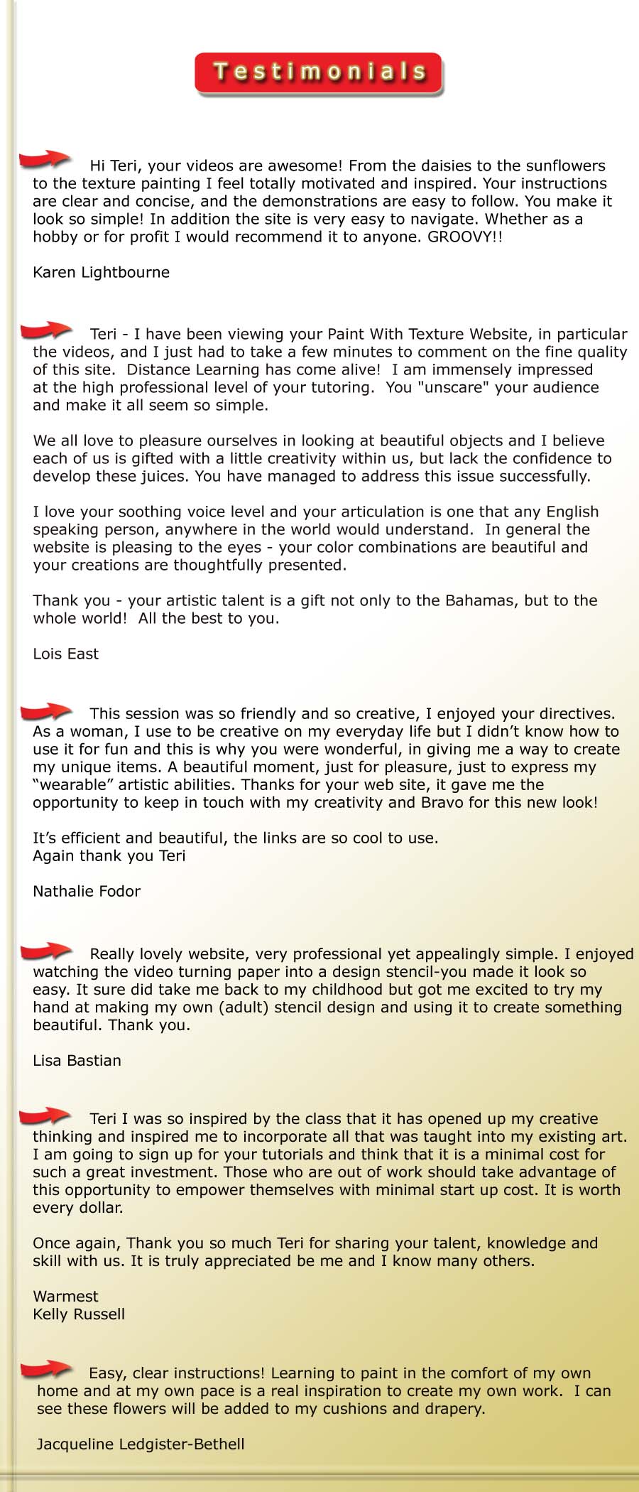 Hello Friend, From: Teri M. Bethel It's true, in just a few minutes of watching my videos you can learn the exact step-by-step system for painting amazing abstract and floral designs that has taken me years to perfect. My easy fabric painting techniques will help you to create marketable designs that can be applied to just about any surface. So say goodbye to bland products that do not sell and hello to amazing products that keep your customers coming back for more! Click on the video to preview what our students are learning in class. You see, you can begin painting amazing designs in such a short time. There is absolutely no experience required.