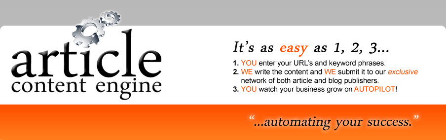 You provide us with the domains and keywords you would like us to promote and we handle the rest! We write and submit articles for you to our exclusive and powerful network of blog and article publishers. This frees you to concentrate on the rest of your business and leaves the internet marketing to the professionals!